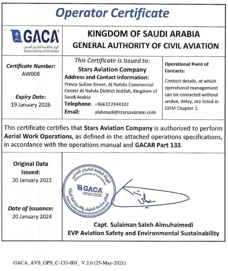 Stars Aviation is certified by the General Authority of Civil Aviation (GACA) to operate Part 133 – Aerial Work Operation – Certificate no. AW008